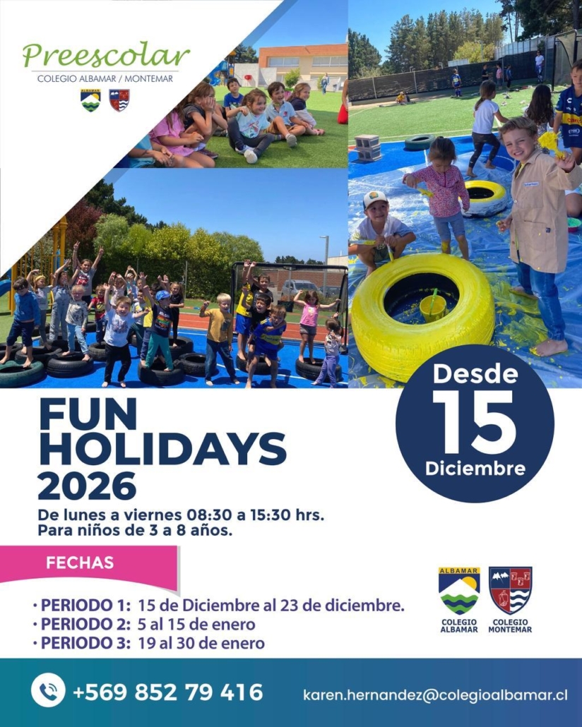 El Fun Holidays 2025-2026 está dirigido a niños y niñas desde Playgroup (3 años) hasta 2° Básico (7-8 años), y podrán participar tanto alumnos de los colegios Albamar y Montemar como también familiares y miembros de la comunidad educativa de Concón y alrededores.